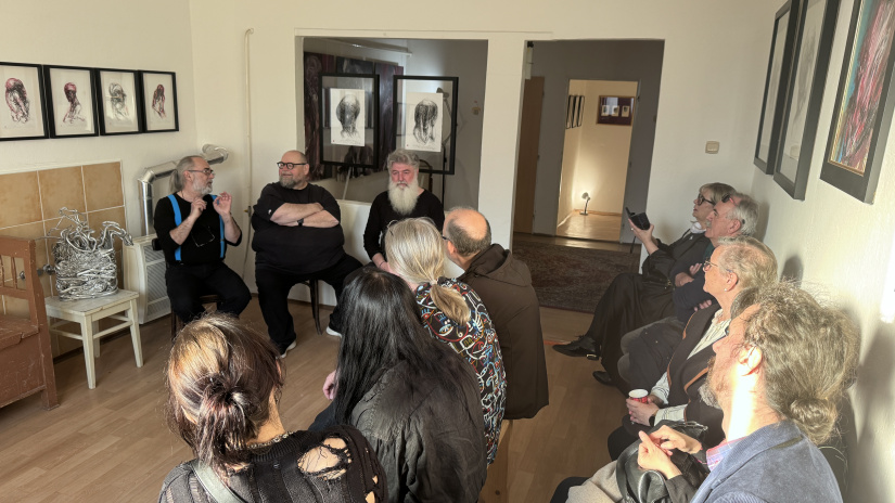 Po vernisáži si záujemci mohli posadať na lavice, priamo v galérii medzi obrazy, kde prebehla emotívne veľmi ľahká, ale obsahovo veľmi náročná a ľudsky hlboká diskusia s autorom Ľubom Gumanom, s hosťom Martinom Knutom a s kurátorom Petrom Križovenským. Ak ste nestihli vernisáž, výstavu si môžete pozrieť ešte do 20. júna v KOMORNEJ GALÉRII na Námestí slobody 81 vo Vranove. Info – Facebook: Komorná galéria Vranov.