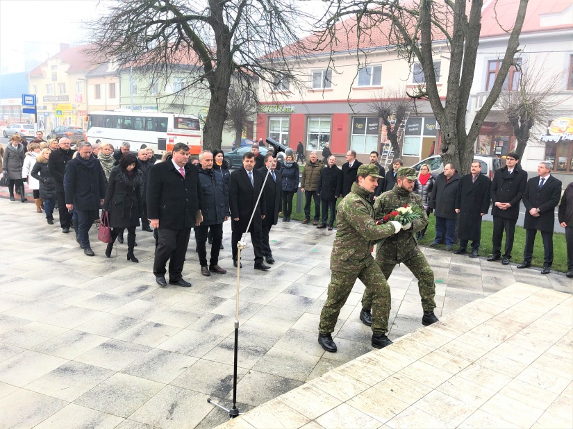 V rámci pietneho aktu sa prítomným prihovoril primátor mesta Ján Ragan. Z príhovoru vyberáme: Mier je vzácny a veľmi krehký. Ešte stále medzi nami žijú ľudia, ktorí si hrôzy vojny pamätajú. Kto zažil vojnu, toho život už nikdy nebude taký, ako predtým. Spomienky na chvíle strachu a beznádeje poznačili všetko to, čo prišlo potom. Každé ďalšie ráno už bolo iné. Vo svojich snoch sa každú noc títo ľudia preniesli naspäť do obdobia neistoty, hladu a obavy o svoj život a život svojich detí. Boli to dni, keď sa zo žien stali vdovy a z detí siroty. Pre nás je to história, na ktorú nemôžeme spomínať, keďže sme ju nezažili. Môžeme si ju len pripomínať a uctiť si pamiatku tých, ktorí položili svoje životy za hriechy iných.